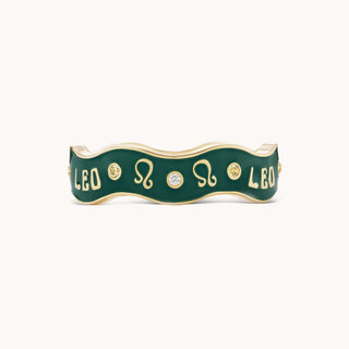 The Wave Collection speaks to our ability overcome challenges and ride the waves of life. With a shape that represents the duality of tranquility and power, as well as water’s ability to cleanse the soul, the stackable Wave Bands align like a perfect yin and yang. In the wanderlust-infused spirit of Marlo Laz, the stacking of the bands is inspired by the Japanese pattern known as Seigaiha, which represents surges of good luck. Available in three sizes that are meant to be mixed and matched. This Zodiac wave band features a motif of Leo, its coordinating symbols, as well as Rubies and Peridots to represent the July and August birthstones.