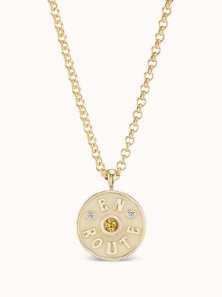 For all our fellow travelers on this journey of life. A reminder to keep moving and evolving, our En Route necklace is about moving forward and not looking back. It symbolizes being En Route to a better self and a better world. This Medium En Route necklace features a Citrine surrounded by two smaller diamonds. The Diamond illuminates its wearer, enhancing inner vision and opening the mind to new possibilities. It is the ultimate gemstone of strength and brilliance.