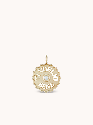 A gold necklace with a circular charm featuring the phrase 'Ti Voglio Bene' and a small pearl in the center