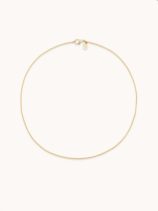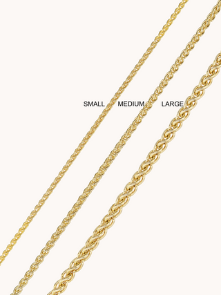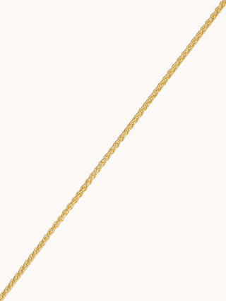 14K Yellow Gold small wheat chain, created with 1.3mm strands of twisted oval links woven together. Additionally, available in several different sizes including medium and large. Classically paired back to our Alphabet Charms. Please reach out to studio@marlolaz.com for custom lengths.