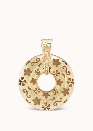 A gold round charm with floral and paisley motifs on a black rubber cord A gold round charm with floral and paisley motifs on a black rubber cord back of a gold round charm with floral and paisley motifs on a black rubber cord