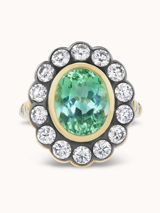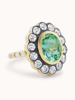The precious Auroa Ring from our Moonstruck collection showcases a beautiful Oval Mint Tourmaline Stone at its center, adorned with white diamonds. A modern heirloom in the making!