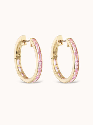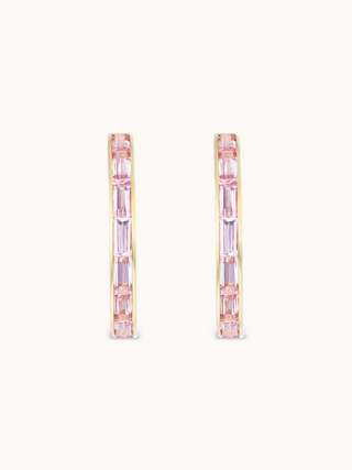 Our Marlo Laz baguette hoop earrings are handmade from 14-karat gold and inlaid with baguette-cut morganite stones. The channel setting is carved out in the back, ensuring the stones sparkle from all angles.