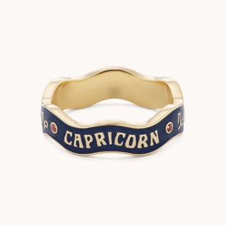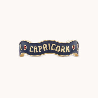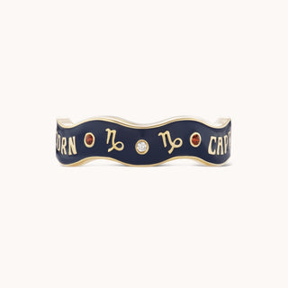 The Wave Collection speaks to our ability overcome challenges and ride the waves of life. With a shape that represents the duality of tranquility and power, as well as water’s ability to cleanse the soul, the stackable Wave Bands align like a perfect yin and yang. In the wanderlust-infused spirit of Marlo Laz, the stacking of the bands is inspired by the Japanese pattern known as Seigaiha, which represents surges of good luck. Available in three sizes that are meant to be mixed and matched. This Zodiac wave band features a motif of Capricorn, its coordinating symbols, as well as Diamonds and Garnets to represent the December and January birthstones.