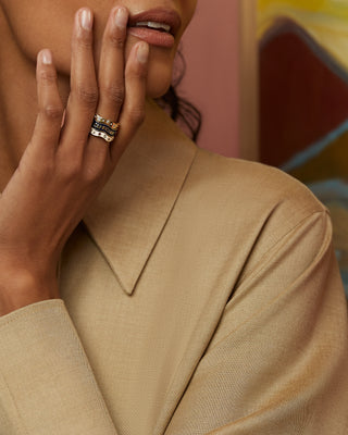 The Wave Collection speaks to our ability overcome challenges and ride the waves of life. With a shape that represents the duality of tranquility and power, as well as water’s ability to cleanse the soul, the stackable Wave Bands align like a perfect yin and yang. In the wanderlust-infused spirit of Marlo Laz, the stacking of the bands is inspired by the Japanese pattern known as Seigaiha, which represents surges of good luck. Available in three sizes that are meant to be mixed and matched. This Zodiac wave band features a motif of Capricorn, its coordinating symbols, as well as Diamonds and Garnets to represent the December and January birthstones.