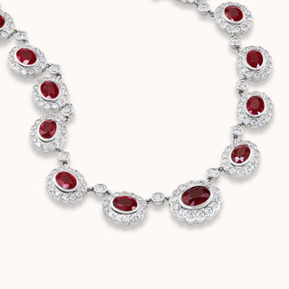 Varying sizes of the iconic Alexandra motif, the Celine Collar features deep, rich rubies set ablaze in white gold, surrounded by white diamonds. A chain created of bezel-set white diamonds glides down the back to reveal a dangling ruby and diamond charm. A symbol of passion, wisdom, and success in love, the ruby is the stone of romance with a truly hypnotic effect.