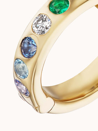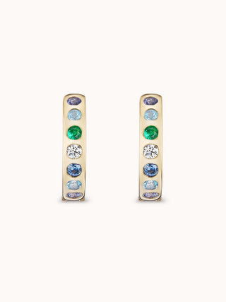 This chic timeless and timeless pair of earrings is our all-time favorite! Handmade in 14-karat gold, it has sparkling stones set at its center, a mix of Tanzanite, Emerald, Blue Sapphire, and White Diamond. Wear yours on its own or stack your ear with multiples, this piece is a perfect everyday staple.