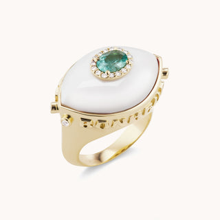 An ancient Talisman originating from the near East, our Eyecon Collection revisits the Evil Eye with our sculptural and ornate perspective. In this special edition, "Je Porte Bonheur", French for “I bring good luck", is artfully engraved on the shank, making this ring the ultimate lucky talisman.