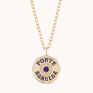 A stunning gold talisman to carry with you, wherever you may go. Our Large PB Charm features an Amethyst bezel, surrounded by a white diamond halo. The hand-painted enamel inscription reads 'Porte Bonheur', French for luck and good fortune.