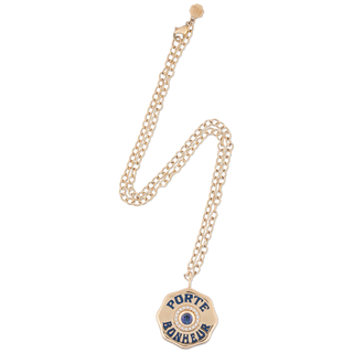 A stunning gold talisman to carry with you, wherever you may go. Our Large PB Charm features a faceted blue sapphire bezel, surrounded by a white diamond halo. The hand-painted enamel inscription reads 'Porte Bonheur', French for luck and good fortune.