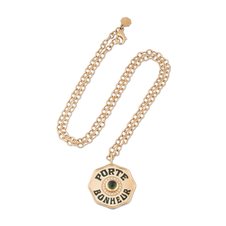 A stunning gold talisman to carry with you, wherever you may go. Our Large PB Charm Necklace features a faceted green tourmaline bezel, surrounded by a white diamond halo. The hand-painted enamel inscription reads 'Porte Bonheur', French for lucky charm.