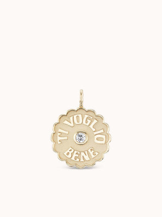 A new midsize love token from the Moonstruck Collection, Italian for “ I love You,” the phrase Ti Voglio Bene speaks to the affection one has towards someone one cares for deeply. For friends, siblings, parents, children, and couples, it is an all-encompassing, unconditional, selfess love., that when translated means “ I want you to be well.” This phrase in raised gold, on a love token formed by the shape of continuous crescent moons.