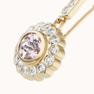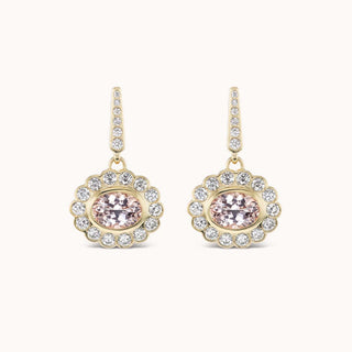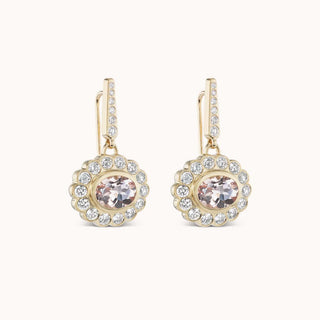 The Lexie Earrings feature an Alexandra-set Morganite at the center adorned with surrounding diamonds. A mini version of our classic Alexandra Earrings and the perfect something special on your wedding day.