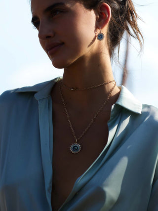 Tie-dye motifs and kaleidoscopic palettes are never far from Marlo Laz's inspiration board - the intricate hand-painted enamel on this necklace showcases just that. Each artful pendant is surrounded by a 14-karat yellow gold crown that's inlaid with Blue Sapphire, Tanzanite and Peridot stones to complement the deep blue tie-dye tones.