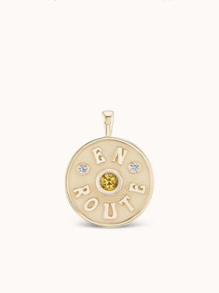 For all our fellow travelers on this journey of life. A reminder to keep moving and evolving, our En Route necklace is about moving forward and not looking back. It symbolizes being En Route to a better self and a better world. This Medium En Route necklace features a Citrine surrounded by two smaller diamonds. The Diamond illuminates its wearer, enhancing inner vision and opening the mind to new possibilities. It is the ultimate gemstone of strength and brilliance.