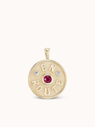 For all our fellow travelers on this journey of life. A reminder to keep moving and evolving, our En Route necklace is about moving forward and not looking back. It symbolizes being En Route to a better self and a better world. This Medium En Route necklace features a Ruby surrounded by two smaller diamonds. The Diamond illuminates its wearer, enhancing inner vision and opening the mind to new possibilities. It is the ultimate gemstone of strength and brilliance.