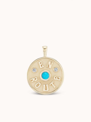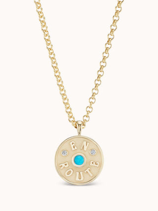 For all our fellow travelers on this journey of life. A reminder to keep moving and evolving, our En Route necklace is about moving forward and not looking back. It symbolizes being En Route to a better self and a better world. This Medium En Route necklace features a Turquoise surrounded by two smaller diamonds. The Diamond illuminates its wearer, enhancing inner vision and opening the mind to new possibilities. It is the ultimate gemstone of strength and brilliance.