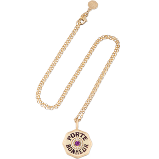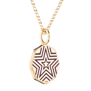 A stunning gold talisman to carry with you, wherever you may go. Our Mini PB Charm Necklace features a faceted Amethyst bezel, surrounded by a white diamond halo. The hand-painted enamel inscription reads 'Porte Bonheur', French for 'Lucky Charm.' On the backside of the coin, you find an engraved enamel star, another powerful symbol of guidance and good fortune.