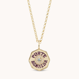 Our signature Marlo Laz amulet, the Porte Bonheur, French for I bring good luck and lucky charm, represents Luck, Happiness, and All Good Things. Our free flowing shaped coin features our bespoke Marlo Laz font, with handpainted enamel and features a stunning Aquamarine. Aquamarine is the gemstone of clarity. It promotes courage, communication and inner peace. Aquamarine is connected to the Pisces and Aries Zodiac signs.