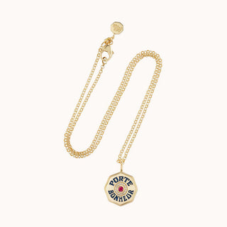 A stunning gold talisman to carry with you, wherever you may go. Our Mini PB Charm Necklace features a faceted ruby bezel. The hand-painted enamel inscription reads 'Porte Bonheur', French for Lucky Charm, and on the backside of the coin, you find a delicately engraved star, another powerful symbol of guidance and good fortune.