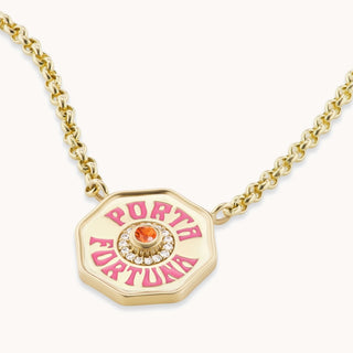 Our signature Marlo Laz amulet, the Porta Fortuna, Italian for I bring good luck and lucky charm, represents Luck, Happiness, and All Good Things. Our free flowing shaped coin features our bespoke Marlo Laz font, with handpainted enamel and features a stunning Orange Sapphire. Sapphires are precious stones that promote abundance and clarity. They reawaken the emotional system and invigorate the wearer by eliciting excitement, zest, and joy. Sapphires are connected to the Virgo and Libra zodiac signs.