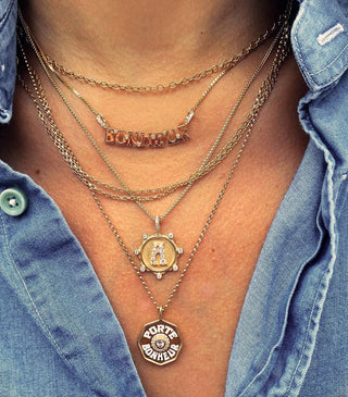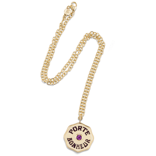 A stunning gold talisman to carry with you, wherever you may go. Our Mini PB Necklace features a faceted Amethyst bezel and the hand-painted enamel inscription reads 'Porte Bonheur', French for Lucky Charm. On the backside of the coin, you find a delicately engraved star, another powerful symbol of guidance and good fortune.