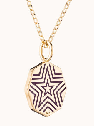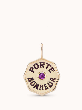 A stunning gold talisman to carry with you, wherever you may go. Our Mini PB Charm features a faceted Amethyst bezel and the hand-painted enamel inscription reads 'Porte Bonheur', French for Lucky Charm. On the backside of the coin, you find a delicately engraved star, another powerful symbol of guidance and good fortune.