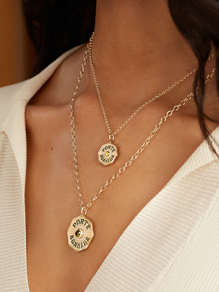 A stunning gold talisman to carry with you, wherever you may go. Our Mini PB Charm features a faceted Black Diamond bezel. The hand-painted enamel inscription reads 'Porte Bonheur', French for 'Lucky Charm', and on the backside of the coin, you find an engraved enamel star, another powerful symbol of guidance and good fortune.