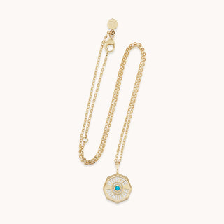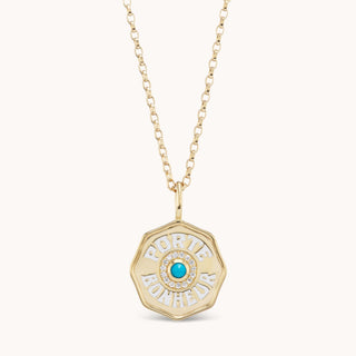 Our signature Marlo Laz amulet, the Porte Bonheur, French for I bring good luck and lucky charm, represents Luck, Happiness, and All Good Things. Our free flowing shaped coin features our bespoke Marlo Laz font, with handpainted enamel and features a stunning Turquoise. Turquoise is the stone of shamans, chiefs, and warriors. A protective stone, it promises wisdom, tranquility, and hope. Turquoise is connected to the Sagittarius and Capricorn zodiac signs.