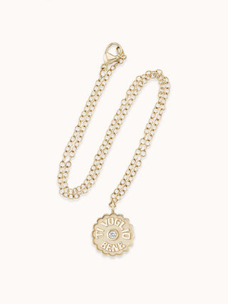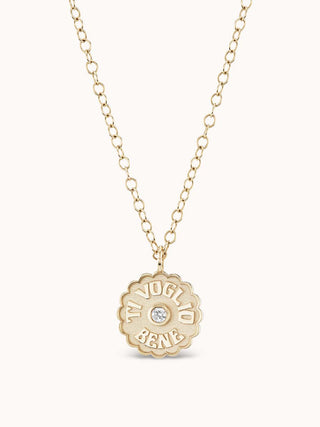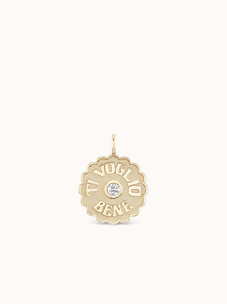 A new mini love token from the Moonstruck Collection, Italian for “ I love You,” the phrase Ti Voglio Bene speaks to the affection one has towards someone one cares for deeply. For friends, siblings, parents, children, and couples, it is an all-encompassing, unconditional, selfess love., that when translated means “ I want you to be well.” This phrase in raised gold, on a love token formed by the shape of continuous crescent moons.