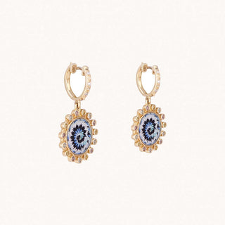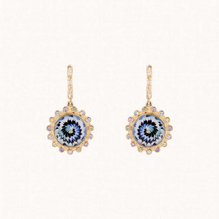 Tie-dye motifs and kaleidoscopic palettes are never far from Marlo Laz's inspiration board - the intricate hand-painted enamel on these diamond hoop earrings ishowcase just that. Each artful pendant is surrounded by a 14-karat yellow gold crown that's inlaid with Tanzanite and Peridot stones to complement the blue tie-dye tones.