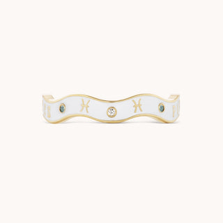 The Wave Collection speaks to our ability overcome challenges and ride the waves of life. With a shape that represents the duality of tranquility and power, as well as water’s ability to cleanse the soul, the stackable Wave Bands align like a perfect yin and yang. In the wanderlust-infused spirit of Marlo Laz, the stacking of the bands is inspired by the Japanese pattern known as Seigaiha, which represents surges of good luck. Available in three sizes that are meant to be mixed and matched. This Zodiac wave band features a motif of Pisces, its coordinating symbols, as well as Amethyst and Aquamarine to represent the February and March birthstones.