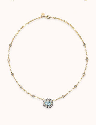 The Single Alexandra Necklace from our Desert Rising collection features an Aquamarine stone at the center strung together with white diamonds. A modern heirloom in the making!