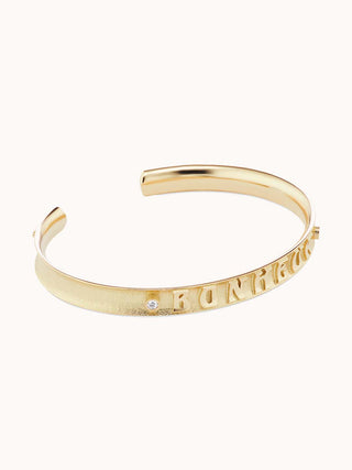 This elegant slim gold Cuff features our bespoke raised Marlo Laz lettering. The inscription reads "Bonheur", French for "I bring good luck", our Slim Cuff serves as a wearable symbol of good fortune. For best results, stack them up and mix cuffs with different widths.