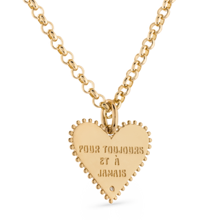Our lovely Marlo Laz Small Pendant is hand-cast from 14-karat gold in the shape of a heart. This most romantic piece stands out through its intricate details, from the delicate gold balls dotted around the edges to the dainty white diamond embellishing its center. The final touch is added at the reverse – an engraving reads "Pour Toujours Et à Jamais", French for "Forever and Always". The perfect gift for a loved one, whether to mark a special occasion, anniversary or just because.