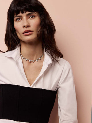 Driving through the sage fields of New Mexico, horseback riding through Georgia O’Keefe’s Ghost Ranch, and hiking through the Aspen Trees, Jesse was inspired to revisit the Desert Rising Collection, introducing a Southwestern Heart Collection. Decorated with gold embroidery of floral and paisley motifs, the Southwestern Heart collection is an ode to the enchantment of the American West and trailblazing women like O’Keefe and Milicent Rogers who embody its spirit. This heart choker necklace is made of mini southwestern hearts attached and linked together by white diamonds.
